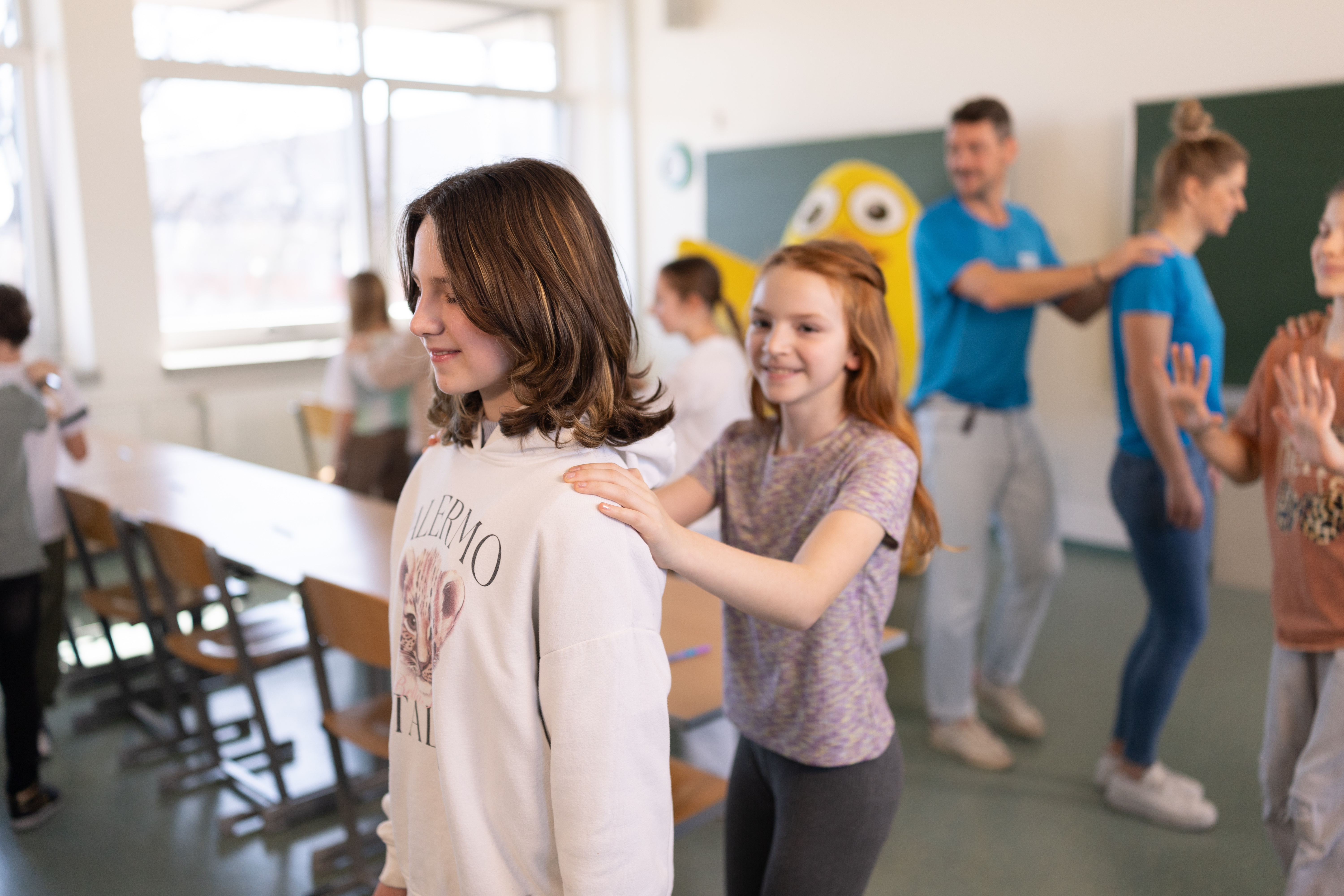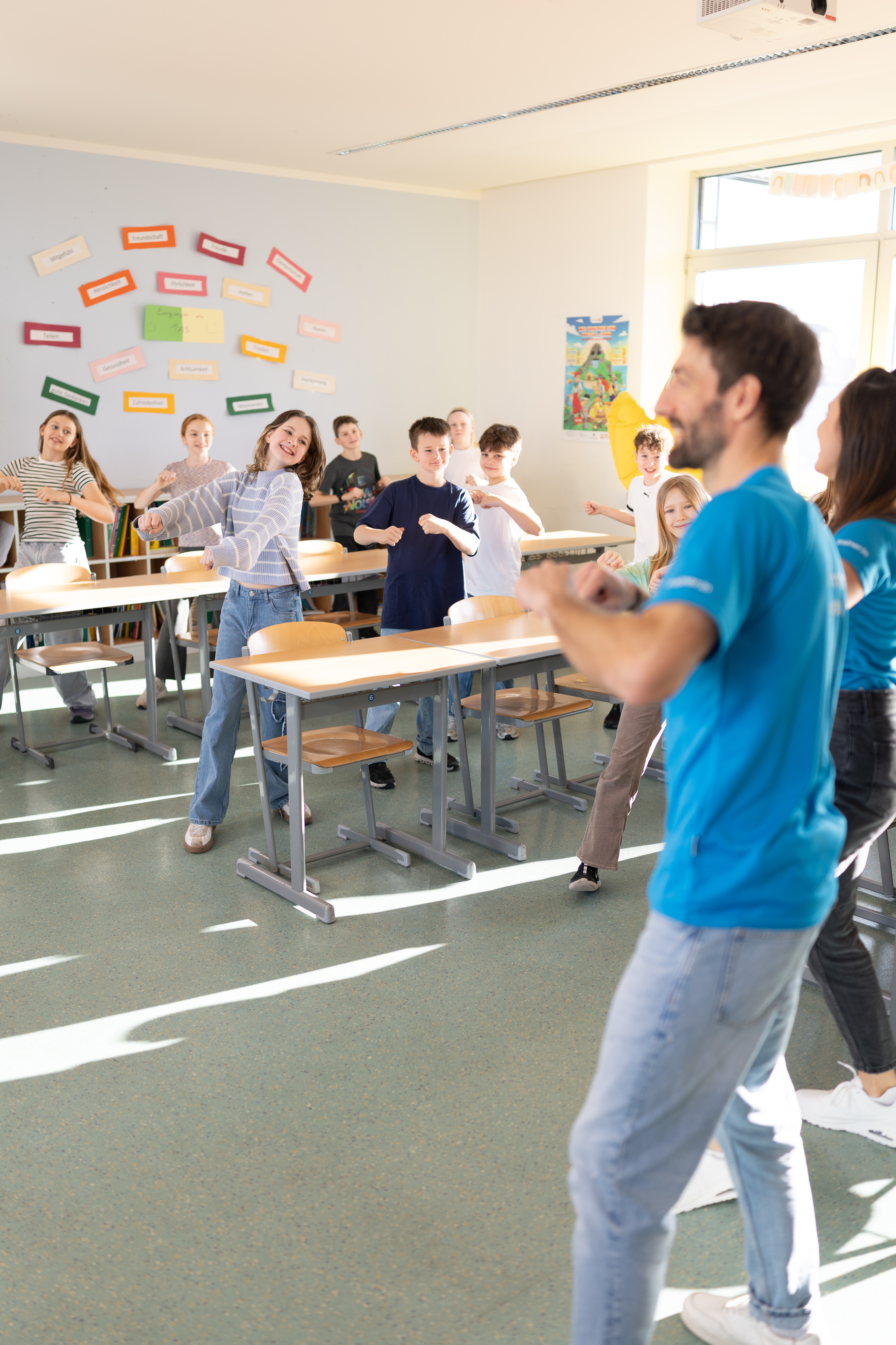 Unsere Coaches und das gesamte Dreh-Team sind mittlerweile ein perfekt eingespieltes Team – von der ersten Idee über die detaillierte Ausarbeitung der Übungen bis hin zur professionellen Organisation des Drehtages. Hinter den Kulissen wird geplant, ausprobiert, angepasst und gelacht, damit am Ende alles reibungslos funktioniert. Auf diese Zusammenarbeit können wir wirklich stolz sein. Ein ganz besonderes Lob verdienen auch die mitwirkenden Kinder. Mit beeindruckendem Durchhaltevermögen, großer Motivation und ansteckender Freude haben sie den doch recht langen Drehtag mitgestaltet. Trotz vieler Wiederholungen und Wartezeiten waren sie stets mit Begeisterung bei der Sache und haben unsere Bewegungsübungen mit Energie und Spaß zum Leben erweckt. Das Strahlen in ihren Gesichtern, das Lachen zwischen den Aufnahmen und die sichtbare Freude an der Bewegung sind für uns die größte Belohnung und gleichzeitig die schönste Motivation jedes Jahr auf‘s Neue wieder alles zu geben. Wir sind überzeugt: Die 21. Staffel von „UGOTCHI – Punkten mit Klasse“ wird erneut ein riesengroßer Erfolg und wird viele Kinder in ganz Österreich in Bewegung bringen.